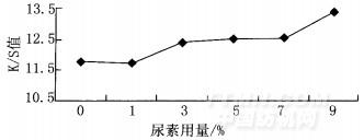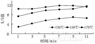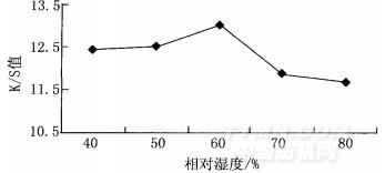 由图可见,当湿度开始增大时可促进色深的增加,但速度缓慢,当相对湿度60%时达到最大促进效果,继续增大湿度相反使色深值明显降低,既不利于色深的继续增加。这是因为分散染料的水溶性tK,J,,