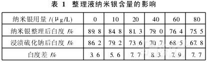 织物经纳米银溶液处理后烘干,水洗5次,烘干,用0.08g/mL硫化钠溶液浸泡5min,烘干,测定织物白度。水洗可去除织物表面的吸附银,因而白度可反映织物上的有效载银量。