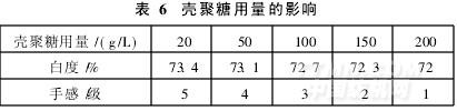 由表6知,壳聚糖对织物白度的影响不大,当其用量达到100g/L时,织物手感变差。由于本研究中纳米银为主抗菌剂,壳聚糖主要起保护和抑制变色作用,因此为防止织物手感变差,选择壳聚糖用量为20g/L。