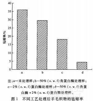 2.1不同处理工艺对羊毛防毡缩效果的影响试验考察了不同工艺处理后羊毛织物的毡缩率,结果如图1所示。