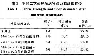 羊毛强力的损失主要与纤维皮质层的损伤有关。由于蛋白酶对表层蛋白的水解速度较慢,所以水解作用首先从鳞片内层的细胞间复合物(CMC)开始逐渐过渡到外层,从而造成羊毛的内部损伤,表现为织物强力下降。表1示出不同工艺处理后织物的强力和纤维直径。