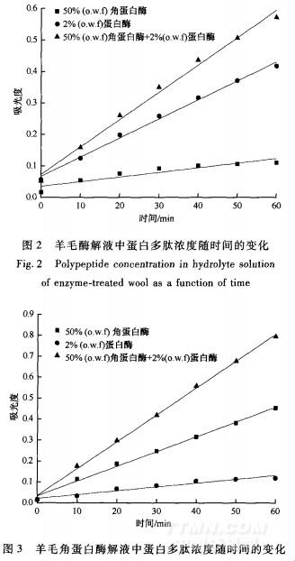 测试了不同酶处理工艺对羊毛纤维和羊毛角蛋白溶液的降解作用,水解液中蛋白多肽含量随处理时间的变化如图2、3所示。