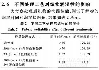 由表2可知,未处理的羊毛织物润湿性很差。单独使用角蛋白酶处理的织物,润湿性稍有提高。因为角蛋白酶虽然能使羊毛鳞片的二硫交联键打开,鳞片层中部分一S—S一还可能被还原成亲水性的mSH或-sso~-’,但鳞片中的拒水性类脂层没有被破坏,因此润湿性改善较少。角蛋白酶+蛋白酶一浴法处理后,织物润湿时间降低至3.88min,润湿接触角为95.71。润湿性明显改善。分析其原因可能为:角蛋白酶对二硫键的断裂作用能使鳞片外层的可及度增大,纤维的亲水性增强,蛋白酶更易攻击鳞片内层,渗入纤维内部,水解皮质层和CMC;在蛋白酶的水解作用下鳞片表层的拒水性类脂物随鳞片蛋白的水解而剥离,因此润湿性提高。