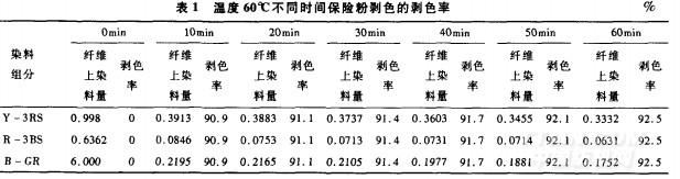 从表1可知,温度60℃不同时间保险粉剥色时,随着时间的延长,纱线的染料残留量明显减少。剥色率大大地提高。剥色时间在50~60min比较合适。