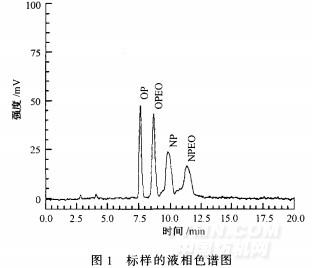 以OP,OPEO,NP,NPEO的混合标准溶液(OP的质量浓度为0.25mg/L,其它均为0.5mg/L),采用不同的流动相和分析条件进行测定,结果表明,当流动相为纯甲醇时,只出现2组色谱峰,第1组色谱峰是OP和OPEO产生的,第2组色谱峰则对应于NP和NPEO,且这2组色谱峰也未能完全分离。当流动相V(水):V(甲醇)=10:90时,分离效果有所改善,OP与OPEO之间基本能完全分离,但NP与NPEO之间未能完全分离。当流动相V(水):V(甲醇)=15:85时,各色谱峰能完全分离,但NPEO的色谱峰峰形较差。在流动相中加人一定量的乙睛可以进一步改善分离效果,分别选用V(水):V(甲醇):V(乙睛)=10:86:4、15:81:4,15:75:10,13:81:6,13:82:5,14:81:5的溶液作为流动相,研究其分离效果。结果表明,当流动相v(水):V(甲醇):V(乙睛)=13:81:6时,各色谱峰峰形尖锐,分离效果也比较好,如图1所示。因此,确定流动相为V(水):V(甲醇):V(乙睛)=13:81:6。