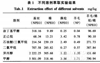 超声萃取时,先用30mL甲醇超声波处理30min,吸取上层清液后,接着用20mL甲醇超声波再处理20min,吸取上层清液后,再用20mL甲醇超声波处理10min,合并上层清液。结果测得蚕丝中NPEO的含量分别为3194.93、3682.13、3816.95mg/kg.