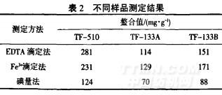 螯合铁离子能力以1g螯合剂样品螯合Fe3+的量(以Fe203计)X表示,数值单位为mg/g.
