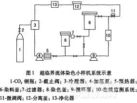纺织品超I临界流体染色小样机(苏州大学等单位研制,可实现染色流体的循环,染后染料、气体的分离回收及系统的在线清洗等),其示意图如图1所示超临界流体在线监测系统主要由带可视化窗口的高压腔体、紫外.可见光谱检测器及软件控制系统和成像系统等组成。