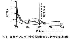 图5表明,在真丝织物的染后系统中,随清洗次数的增加,其清洗流体中活性分散红GC染料的特征吸收峰逐渐降低,系统中残留染料浓度减小,表明利用超临界CO2流体本身对染料的溶解性可对染色循环系统起到清洗作用。同时,当清洗次数(n)达到7次时,清洗流体在线吸收光谱曲线的活性分散红GG特征吸收峰消失,表明此时系统中残留的染料被基本清洗干净。如果增大清洗流体压力和/或升高清洗流体温度等,则可进一步提高清洗效率,缩短系统的清洗时间。
