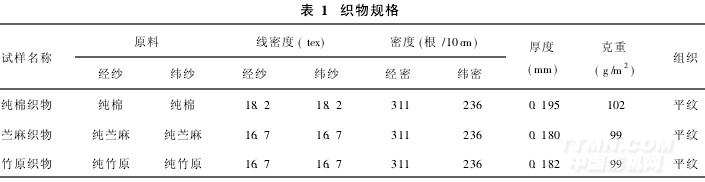 试验样品选择相同规格的苎麻织物和竹原纤维织物,以及相近规格的纯棉织物。其中苎麻织物和竹原纤维织物由湖南士达纺织厂有限公司提供,纯棉织物由常州新光纺织有限公司提供。主要规格如表1所示。