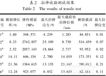 按照国标GB/T2035-1996,用手锯将开发形成的竹原纤维/聚乳酸复合材料板材沿横向、纵向和斜向三个方向裁剪,最宽为20mm,最窄为10mm,长为180mm,各3块,在实验室温湿度下(18℃、50%),在INSTRON万能强力机上进行拉伸试验,拉伸速度为10mm/min,试验结果如表2所示。