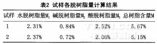 按章节3 树脂含量的测定过程计算各工序脱树脂量结果,如试样1水脱落树脂量计算为: