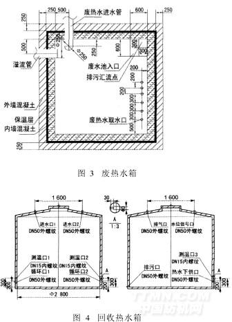 该分系统的功能是负责各种能源介质的输送和储存。系统设有废热水箱(图3)、回收热水箱(图4)及输送管路,根据实际生产需要及时储存或供应热水。该分系统采用先进的保温结构及保温材料,实现了回收过程热能损失的最小化,保温热水水温每24h只下降1~3℃。