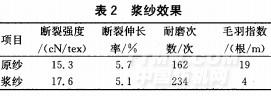 使用YG061型电子单纱强力仪、IFY2A型纱线耐磨仪、YG171D型毛羽测试仪对棉/汉麻混纺纱浆纱前后的断裂强力和断裂伸长率、耐磨次数、毛羽指数进行测试,具体结果如表2所示。