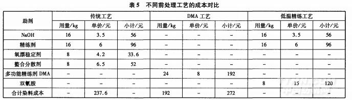 表5中,H202/双氰胺活化体系低温练漂工艺漂白1t纯棉针织布的染化料成本仅比传统工艺高34.4元,比DMA工艺高80元。