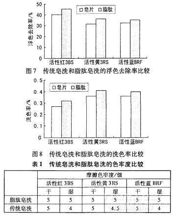 由图7,图8和表1可知,脂肽皂洗后的湿摩擦色牢度要明显好于传统皂洗的湿摩擦色牢度,两者的干摩擦色牢度则相当。