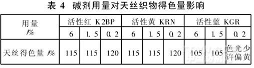 从表3~5试验可以看出,适当增加尿素、碱剂、防染盐用量,可提高活性染料在未丝光天丝织物上的得色量,而助剂用量变化对不同颜色、不同浓度的影响不