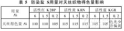 在汽蒸过程中,防染盐S可防止活性染料受还原性物质的影响而导致色萎。将防染盐S用量增加0.5%后在天丝织物上刮样,以常规工艺刮样作标准(100%)进行比较,结果见表5。