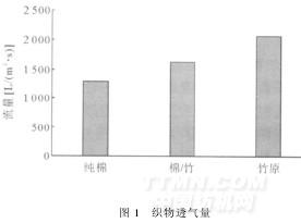 试验测得三种织物的透气量分别为:竹原织物2061L/(m2·s),棉2/竹原1织物1634L/(m2·s),纯棉织物1295L/(m2·s)。由图1可明显看出竹原织物的透气性远优于同规格的棉纤维织物。