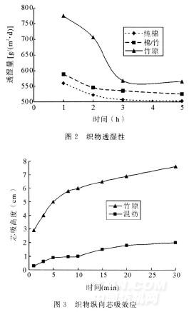 三种织物的透气、透湿、芯吸性能测试结果分别见图1、图2、图3。
