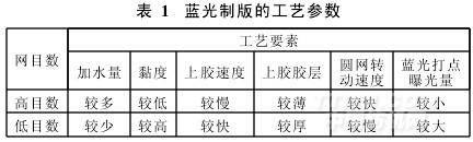 按工艺要求进行镍网的拆箱、检查、复圆、清洗除污。根据不同的圆网目数,调节胶体的黏度和上胶厚度,通过调节圆网转动速度来控制蓝光打点曝光速度。洁润丝SL309高分子蓝光制版材料在LD蓝光制网设备上的优化应用参数见表1。