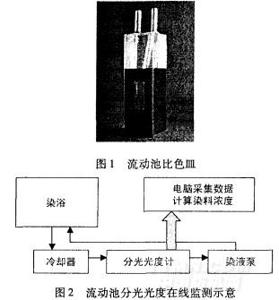染液从染浴通过毛细管导人冷却器降温后,进人分光光度计的流动池比色皿中。电脑通过分光光度计的数据接口,定时读取染液的吸光度数值,实现在线染料浓度分析。