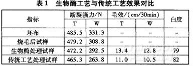 粘胶/亚麻混纺织物经生物酶两步法工艺与传工艺前处理后,其强力、毛效和白度对比见表1。
