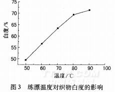 温度是影响漂白反应的重要因素,较高温度能加快漂白速率,而在H202/NOBS活化漂白体系中,温度还会对NOBS产生一定影响。设定工艺条件:DM.13610.4g/L,DM一13701.5g/L,35%H2026g/L,NaOH2g/L,NOBS1g/L,漂白时间60arin,考察练漂温度对织物白度的影响,结果见图3。
