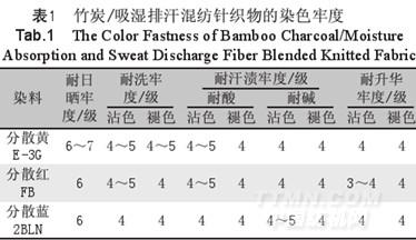用分散黄E-3G、分散红FB和分散蓝2BLN,在用最佳染色工艺对竹炭/吸湿排汗混纺针织物进行染色后,测试其耐洗牢度、耐酸碱汗渍牢度、耐升华牢度及耐日晒牢度,结果如表1所示。