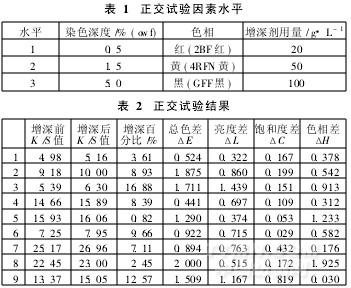 利用正交试验方法对活性染料染色深度、色相和增深剂用量与增深效果的关系进行研究。表1为试验因素水平,表2为试验结果.
