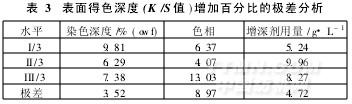 由表3知,增深处理能够在一定程度上增加染色试样的表面深度,但是对于不同颜色和染色深度的试样,其增深程度也不同。其中,色相的不同对于增深效果的影响最大,其次是增深剂的用量,而增深效果与染色深度的关联程度最小。这说明增深处理对于不同颜色的增深作用有差异,对黑色的作用效果比较显著,而对于黄色的增深效果最差。这对于增深剂应用于实际生产有重要的指导意义。