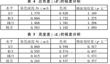 而表2结果表明,总色差的变化主要来自于亮度差(ΔL)的变化。对影响亮度差(ΔL)的变化因素进行极差分析(见表5),色相、增深剂的用量以及样品染色深度对亮度差(ΔL)的影响规律也与总色差(ΔE)和表面得色深度(K/S值)的分析结果相一致。从理论上讲,亮度差(ΔL)主要表示了试样的增深程度,也就是说增深处理主要影响试样的染色深度,对于所处理染色试样的色光的改变相对要小得多。
