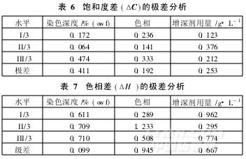 为了详细考察增深处理对颜色的综合影响,我们对处理前后样品的总色差变化、亮度差变化、饱和度差以及色相差的变化做了极差分析,如表4~7所示