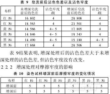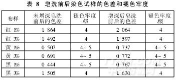 表8为增深处理对皂洗前后褪色牢度的影响。表8中的牢度级别均由CMC色差式测出的色差判断。