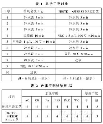 传统皂洗工艺与中和皂洗剂PROTE(-SPERSENRC工艺的对比见表1。