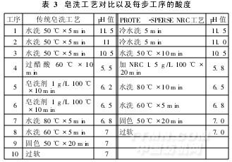 传统皂洗工艺与中和皂洗剂PROTE(-SPERSENRC工艺及酸度的对比见表3。