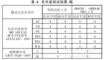 (1)使用PROTE(-SPERSE NRC皂洗后,水洗、耐水及摩擦牢度与常规皂洗工艺相同。