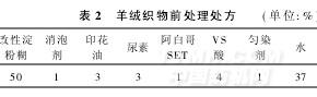 上浆后羊绒织物的烘干一般采用热风式烘干。烘干温度不宜高过100℃。羊绒织物前处理处方见表2