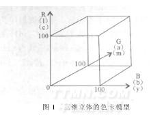 我们对羊绒织物印花颜色采用的色卡调色法,色卡调色法是通过对比色卡中的颜色来调色。其基本过程为:首先,制作色卡文件。可以选择一种或几种颜色模式来建立色卡模型,色卡模型为一个三维立体(LAB模式和RGB模式)或一组三维立体(CMYK模式),如图1所示。