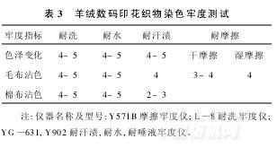 染色牢度也是印花技术的一个关键指标。按照GB/T 3920-1997、GB/T 3921.1-1997、GB/T3922-1995和GB/T5713-1997染色牢度试验方法,对羊绒织物耐摩擦色牢度和耐洗色牢度进行测试,各项牢度良好,结果参见表3。