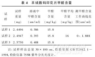分别取3个羊绒数码印花片试样,测其甲醛含量,其结果满足低于标准甲醛含量,结果参见表4.