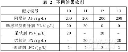 比较两种常见的柔软剂PS和PN对织物摩擦牢度的影响。按表2的配方配制阻燃整理工作液。