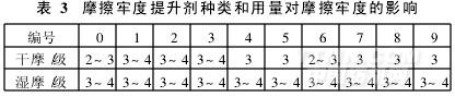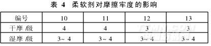 表3中,三种摩擦牢度提升剂对于摩擦牢度的提升作用有所不同,其中摩擦牢度提升剂YL效果明显,这与三种摩擦牢度提升剂的结构类型有关。聚氨酯类的摩擦牢度提升剂YL,可在麂皮绒表面形成具有弹性且滑爽的膜,从而起到一定的保护作用,同时也降低了织物表面的摩擦因数;摩擦牢度提升剂SL属于有机硅类聚合物,它虽然摩擦因数较小,但是对织物表面的保护作用不如聚氨酯类,而且因其易燃,对阻燃效果也有不利的影响;摩擦牢度提升剂AM属于三聚氰胺类,主要起一定的交联作用,但是麂皮绒类面料属于涤纶超细纤维织物,采用分散染料染色,三聚氰胺类的交联作用对阻燃剂和分散染料几乎不起作用,因此对于摩擦牢度没有改善。故在研究柔软剂对摩擦牢度的影响试验中,选用摩擦牢度提升剂YL。
