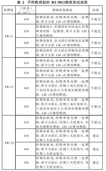 (3)经FR-Ⅲ阻燃胶涂层的试样,涂层膜很容易烧破,在上胶量达130 g/m2(干重)时,织物沿着破洞处边燃烧边向周围卷起,填充物也有烧着现象。但移开火源后,织物和填充物上的火焰马上熄灭,故被认定为能通过BS 5852阻燃测试。