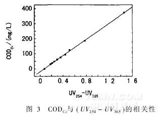 测定未经过滤处理试样的UV254、UV365与CODCr,计算ΔUV(=UV254-UV365)。ΔUV与CODCr的相关性见图3。拟合的回归方程为: