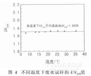 为了研究温度对试样UV254值的影响,分别在温度为7.8、13.2、15.2、18. 6、21.5、25.5、29.2、35.5℃下