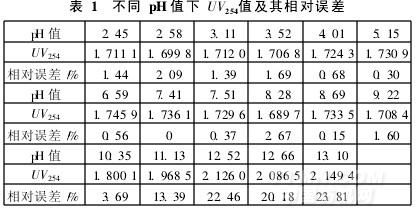 将同一水样等分成若干份,分别用硫酸或氢氧化钠调节pH值,然后测定其UV254值(见表1)。表1中,pH值为2.45~9.22,UV254变化不大; pH>10时,UV254显著增大。这主要是由于pH值不同,有机物的显色基团会发生变化。因此,不同废水的UV254随pH值的变化规律是不一样的。以pH值为7.41时的UV254为基准,计算各pH值下UV254的相对误差,结果见表1。