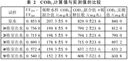 将印染废水折流式水解反应器(设5个格室)中进水及各格室的出水稀释4倍,分别测定UV254、UV365及CODCr。采用扣除UV365的方法以消除悬浮物的影响,并按回归方程(4)计算CODCr值,与实测值进行比较,结果见表2。