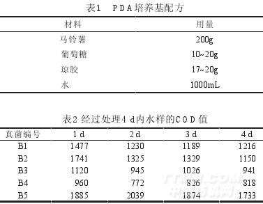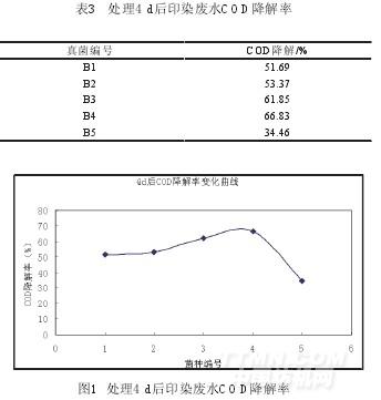 2.3 投菌实验 待已筛选出来的真菌B1、B2、B3、B4、B5培养3 d 后分别投入印染废水中,进行COD测试实验,观察其COD降解情况。COD降解测量用重铬酸钾法进行。