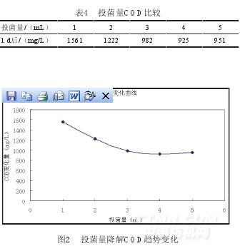 3.1 实验结果 原水样COD值=2466mg/L。4d后所得被测定水样COD降解率如表3所示。通过实验发现B4降解COD效果最佳,所以,抽取B4号菌种作为定量测试菌种。投菌量分别为1、2、3、4、5 mL。1d后,所得数据见表4。变化曲线见图2。